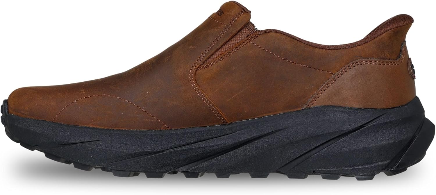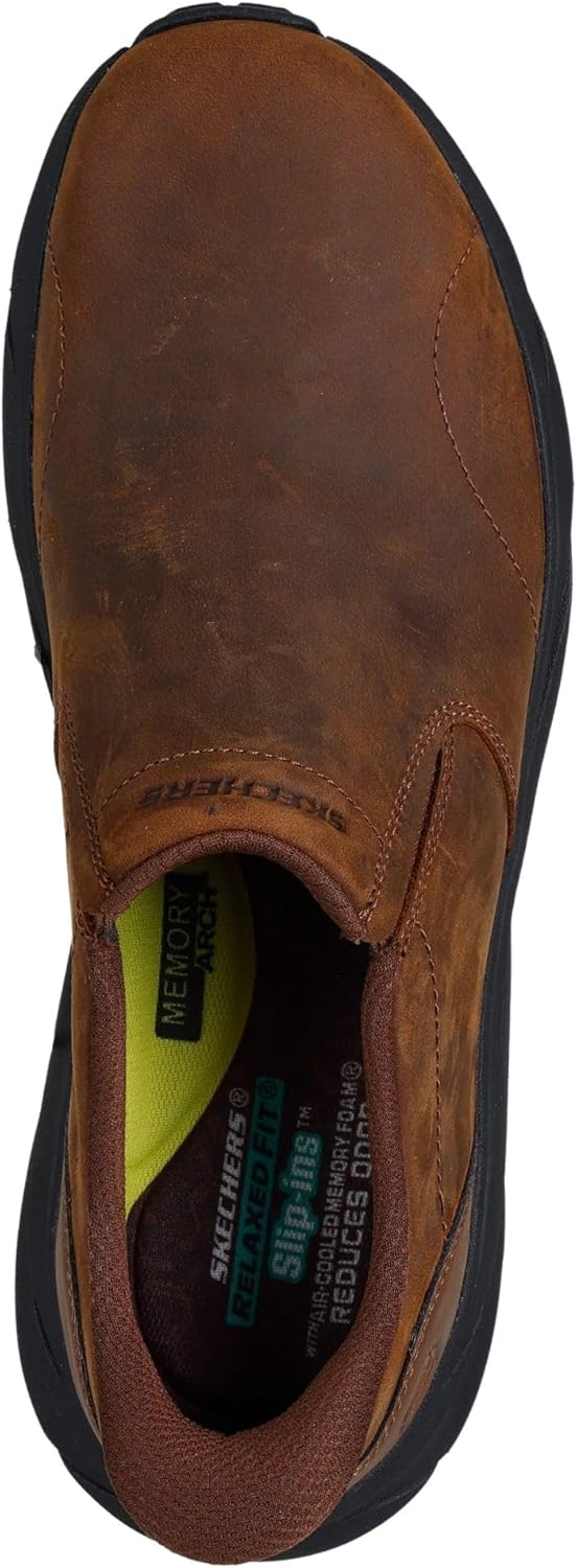 The Skechers Men’s Conner – Rayne features Hands Free Slip-ins® technology for an easy fit and a Relaxed Fit®, providing a roomy comfort fit at the toe and forefoot. It includes Skechers Air-Cooled Memory Foam® cushioned comfort insole for added cushioning and a Charcoal-infused insole to help neutralize potential odor. The Goodyear® Performance Outsole delivers enhanced traction, stability, and durability, making it perfect for various terrains. With a Plain Toe and Slip-On Moccasin style, this shoe combines comfort, support, and practicality for everyday wear.