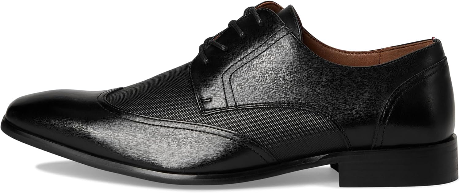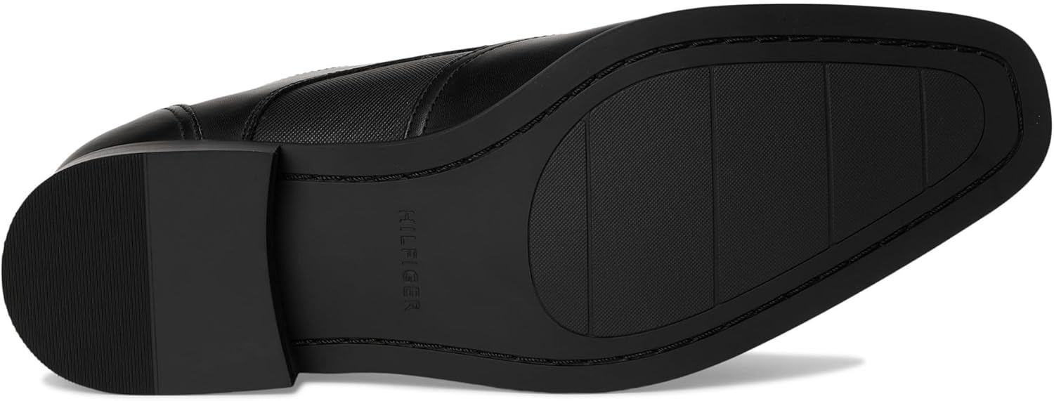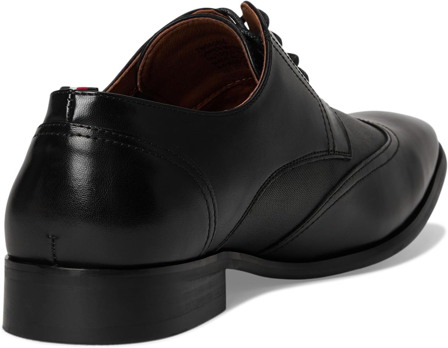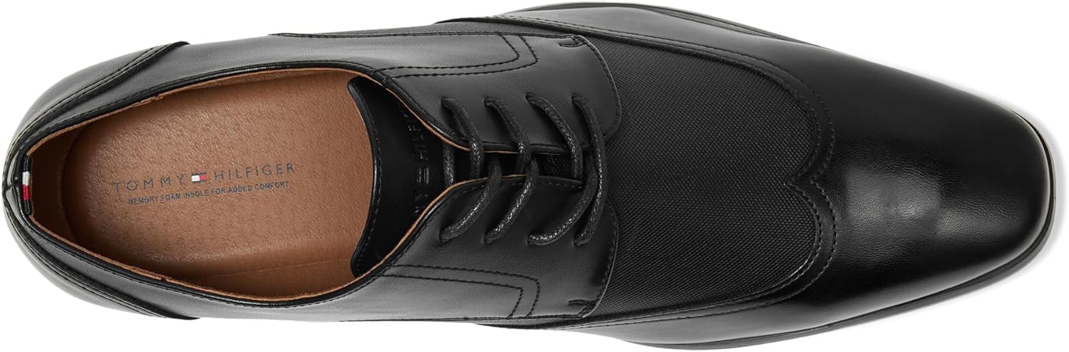 The Tommy Hilfiger Sagent is a handsome oxford that stands out with a crisp wingtip, squared toe, and textured detail on the sides. Paired with a cushioned memory foam insole, these shoes elevate your look. Faux leather upper. Man-made lining. Lace-up closure. Low-top profile. Stacked block heel. Rubber outsole.